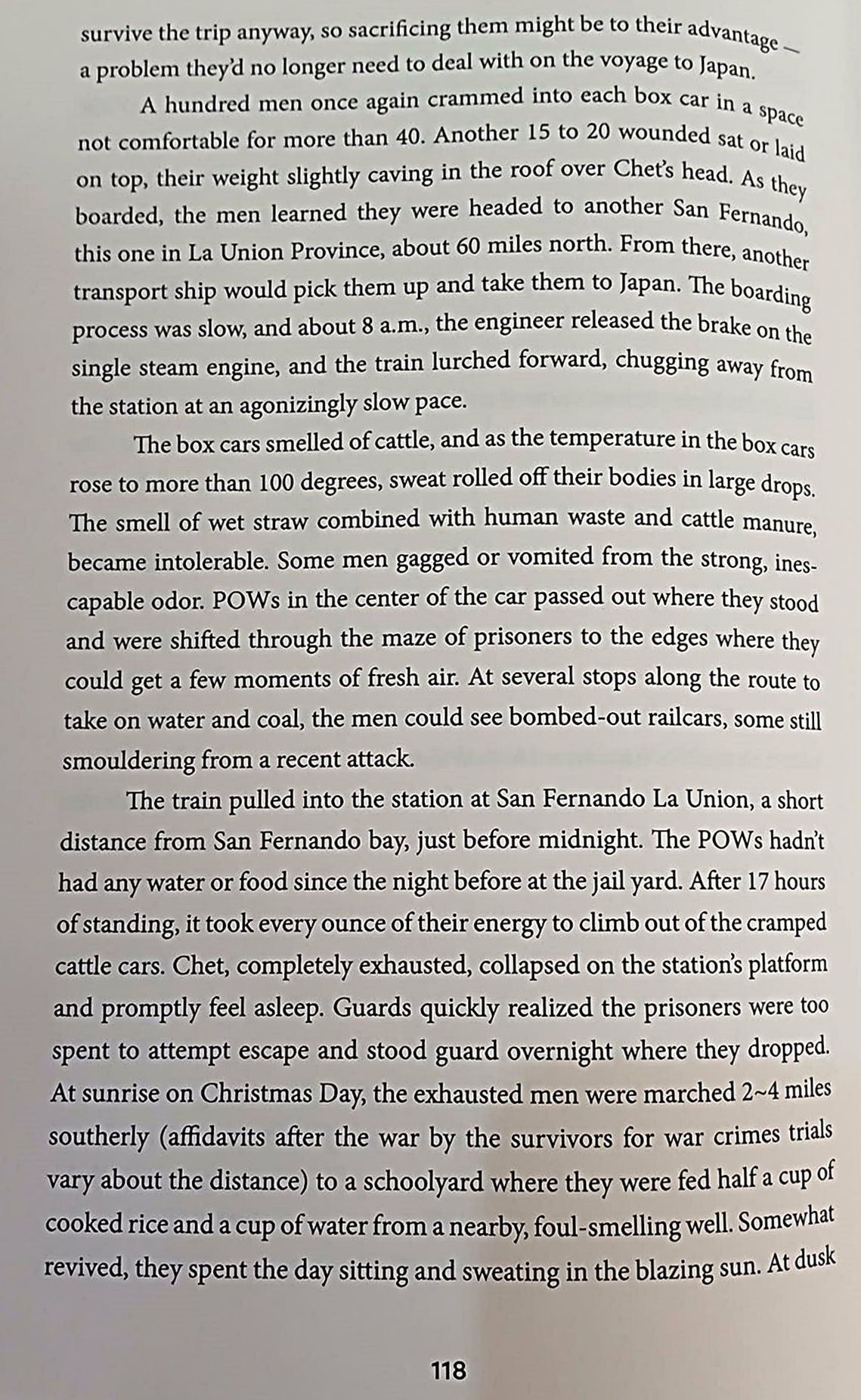 # 02 Capas Railroad Station. This is page 118 of the new book “Relentless Hope: A True Story of War and Survival, by David L. Britt”. John Duresky edited what he wrote and did most of the research. Now he is visiting the sites. This page describes the hellish rail ride.