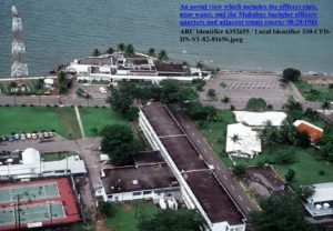 Zc799. A view of the “Officer Country” in the U. S. Naval Station Subic Bay in 1981 from the U. S. National Achieves. An aerial view which includes the officers club, near water, and the Mabuhay bachelor officer’s quarters and adjacent tennis courts. Photo is from the U.S. Archives.