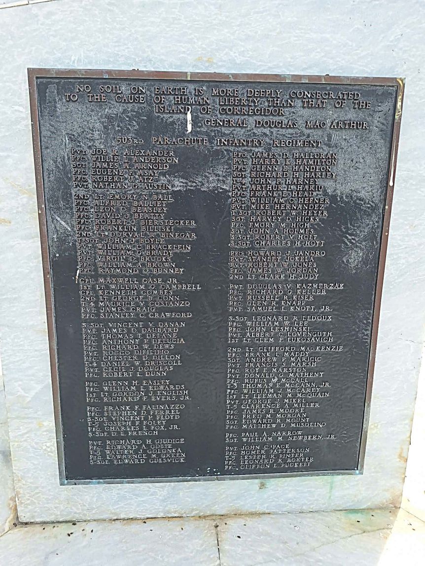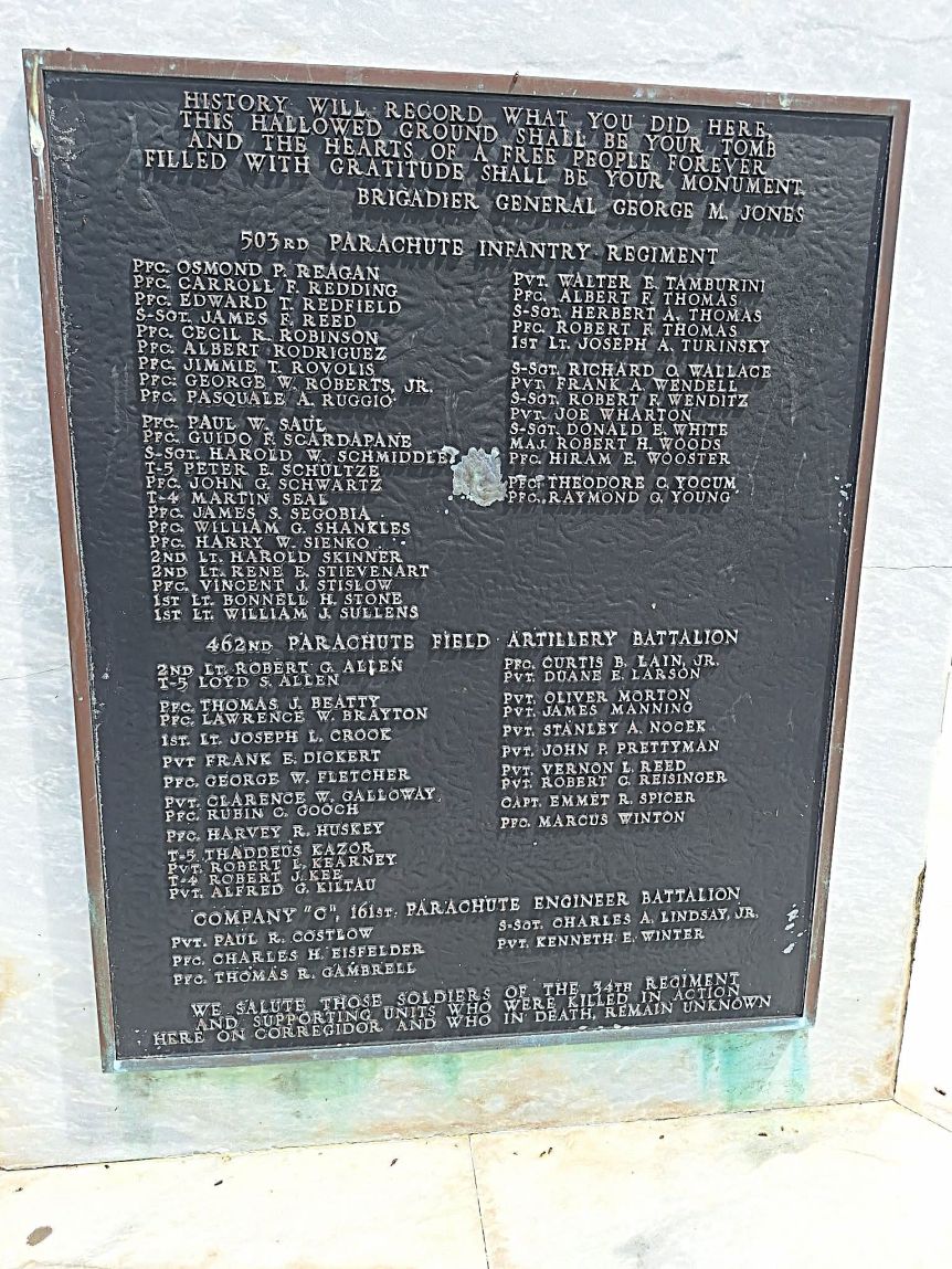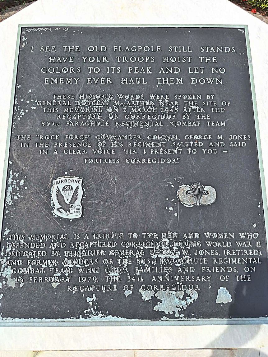 No 29 to No 34 Pacific War Memorial pictures show you the The Rock Force Memorial Monument and its many plaques. It is located at the east end of the Corregidor Topside Parade Ground.