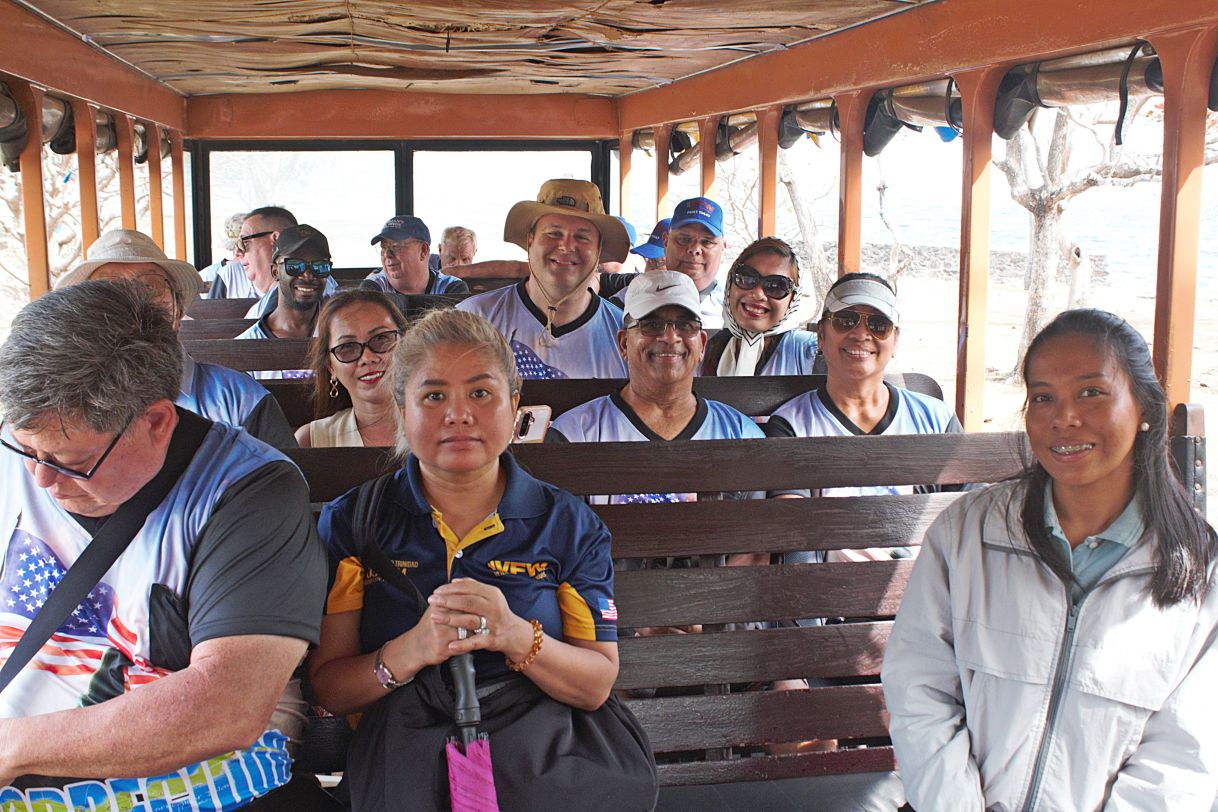 Joe10 Corregidor, VFW11447, we are on the trolley and are on our way to view the famous island Corregidor and the former Fort Mills protecting Manila and bay. Almost everyone is smiling, that is a good sign! The lady at right is our tour guide.