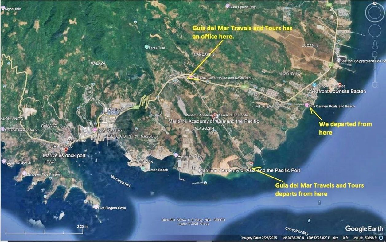 Joe11 to Joe13 Corregidor, VFW11447 pictures are Google Earth graphs showing the way how most visitors visit Corregidor these days, since the virus from China shut down Sun Cruises a few years ago. Guia del Mar tour operator offers transportation from Manila!