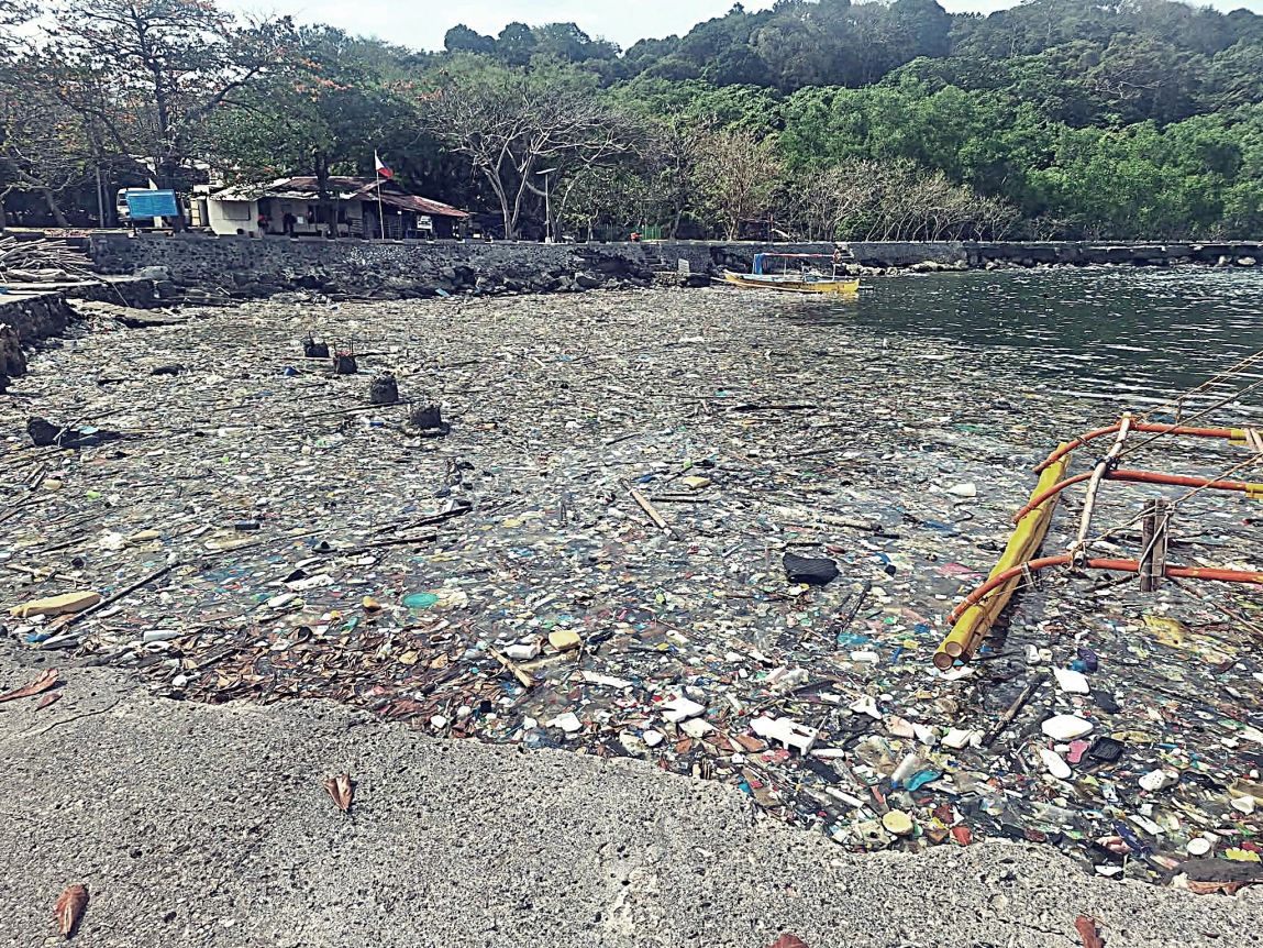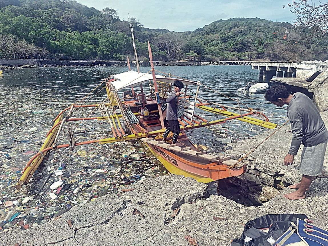 LAS04 to LAS06 Corregidor, VFW11447 pictures show us debarking the boats, inside of the North Mine Dock on the North Shore of Corregidor. Putting the bow into the hole of the concrete shore made the debarking a little easier (picture LAS04). But all 3 pictures show us the trash problem in Manila Bay, especially now with the prevailing NE Winds driving the trash right into this Corregidor cove.