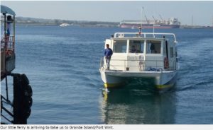 Our little ferry is arriving to take us to Grande Island/Fort Wint.