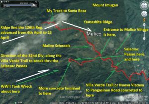 The Malico Village (Barangay), the Salacsac Passes, the new Nueva Vizcaya to Pangasinan Road along the track of the old Villa Verde Trail area zoomed in with Google Earth. I marked it with relevant geographic points in the album plus it shows our GPS track.