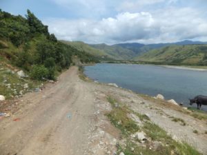 The new Zambales –Tarlac Road has to cross the Baquilan River, but no bridge has been started yet. The track at left is used now to reach the river fording area and all vehicles constructing the new Zambales –Tarlac Road are going this way.