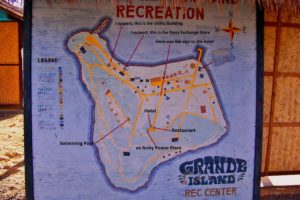 This Grande Island ex MWR map on a piece of plywood still existed in 2006. It was standing where the Navy cottages were and were the new cottages are now. But after 2006 it disappeared. MWR stands for Navy Morale, Welfare and Recreation Department. I marked it up to indicate the sites of the subjects of this presentation.
