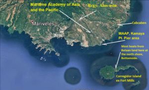 Za921. A Google Earth image showing the boat landing areas from the MAAP-Kamaya Pt Pier area in Barangay Alas-asin, Mariveles, Bataan, to Corregidor Island, Cavite.