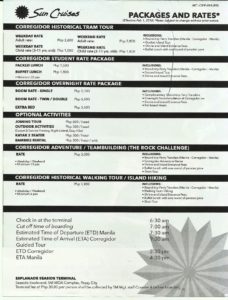 Zc228. The back side of the Sun Cruises Corregidor Fee Schedule brochure. It was not clear to me how much the fee was if you stay overnight in the Inn and would like to go on the tour.