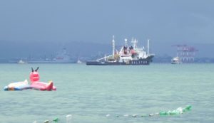 Zc238. One of several images showing the beach, the busy bay of Subic Bay at the beach side of the Midnight Rambler Beach Bar where our VFW Post 11447, Subic Bay, celebrated the 4th of July 2018. In the background, if you look close, a Military Sealift Command Ship (MSC) and oiler is pulling in. They frequently stay in Subic Bay.