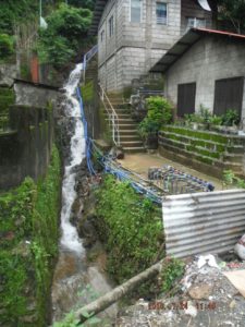 Zc477. Walking on the National Road from Barrio Barretto to the Kalaklan Gate of the SBFZ, this is above Sierra Beach, just leaving Barretto. This picture is interesting because of several reasons- the water rushing down and the fresh water connections, they are new, and maybe a year ago all these people living here on the slopes got their fresh water connection-FINALLY!
